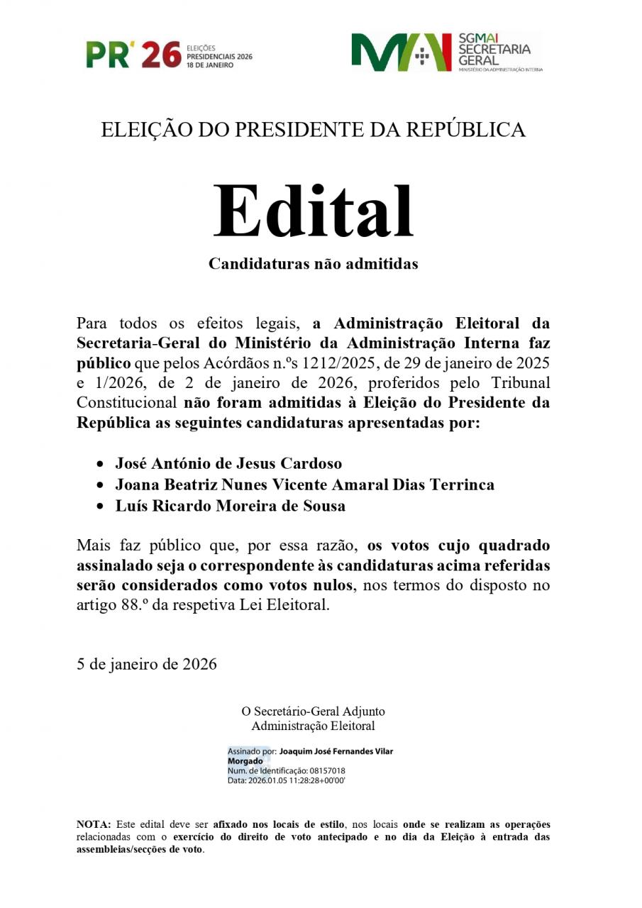 Eleição do Presidente da República - 18 Janeiro 2026 - Candidaturas Não Admitidas